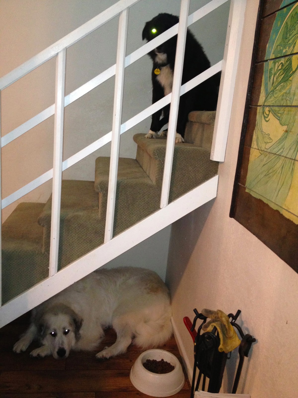 Bella in her favorite cool spot, under our stairs with her food bowl where she can see it. Dexter on the other hand, is sitting where he knows she can see him and get excited with him close to her dish. They play a game every day. She lays down, he sits on the stairs and torments her until she barks and growls and chases him away.
